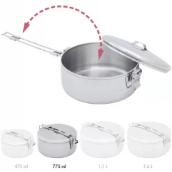 Haute de 8 cm et large de 17 cm, cette popote CAO pour 1 personne affiche une taille normale. Sa contenance est de 1,2 litre. Son poids avec accessoires atteint 434 grammes. Son format est adéquat pour une utilisation en grande randonnée ou en camping. Comme vu précédemment, il s’agit d’une popote en inox. Pratique, sa poignée est escamotable pour un gain de place évident pendant le transport. La tasse en plastique possède une petite poignée pour éviter de se brûler : pratique pour le café, le thé ou la soupe.